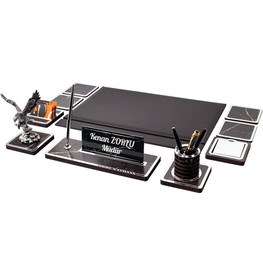 Masa düzeninizi sade ve şık şekilde tamamlamak üzere tasarlanmış 10 farklı parçadan oluşan mermer desenli ahşap parçaların, deri sümenin ve isim ve ünvan baskılı masa isimliğininde yer aldığı bu şık set dilerseniz kendinize veya sevdiklerinize alabileceğiniz şık bir hediye olacaktır.