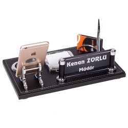 Deri masa üstü isimlik setimiz malzemesi, rengi, işçiliği , aksesuarlarıyla masanıza eşsiz bir şıklık katmak için tasarlanmıştır. Özel İşçiliğe sahip dikişli deri, gümüş renk kartvizitlik , notluk, gümüş renk tükenmez kalem, ataçlık ve telefonluk ile göz dolduran bir isimlik setidir. Ürün içerisinde not kağıdı hediyemiz olarak gönderilmektedir.