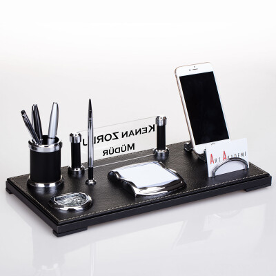 Deri masa üstü isimlik setimiz malzemesi, rengi, işçiliği , aksesuarlarıyla masanıza eşsiz bir şıklık katmak için tasarlanmıştır. Özel İşçiliğe sahip dikişli deri, gümüş renk notluk, ataçlık, telefonluk alanı ve kalemi ile göz dolduran bir isimlik setidir. Ürün içerisinde not kağıdı hediyemiz olarak gönderilmektedir.