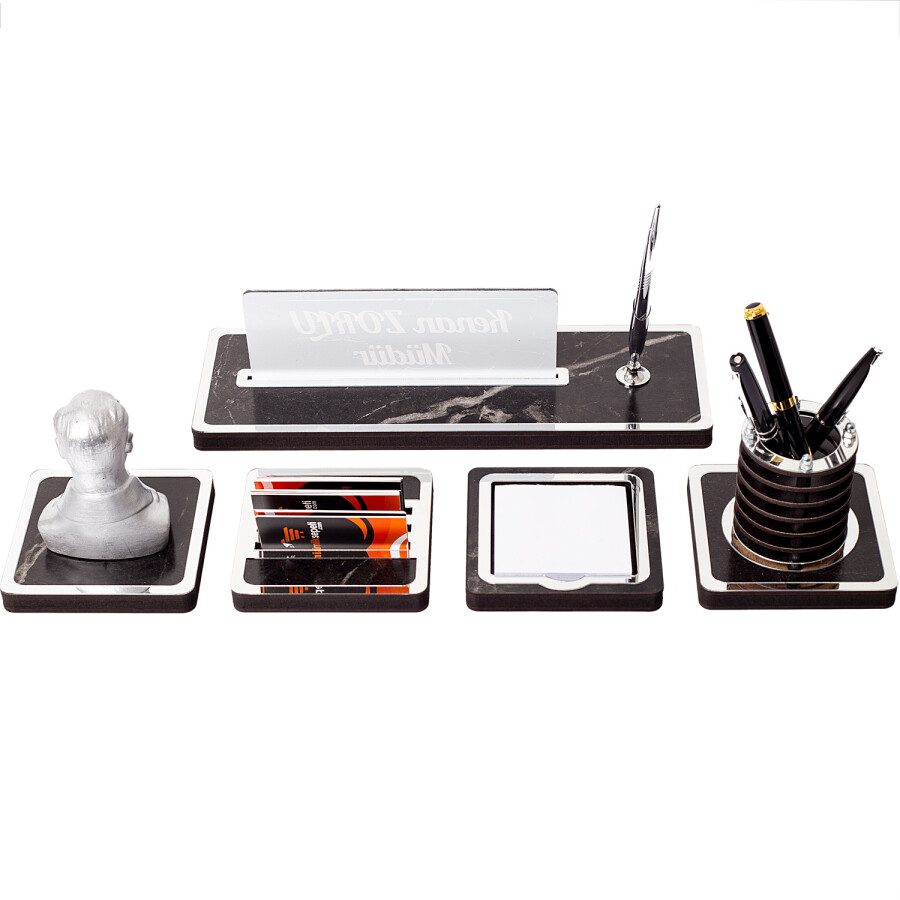 İncelemekte olduğunuz isimlik seti, masa isimliği, kalemlik, notluk, Atatürk biblosu ve kartvizitlik olmak üzere 5 farklı parçadan oluşmaktadır.