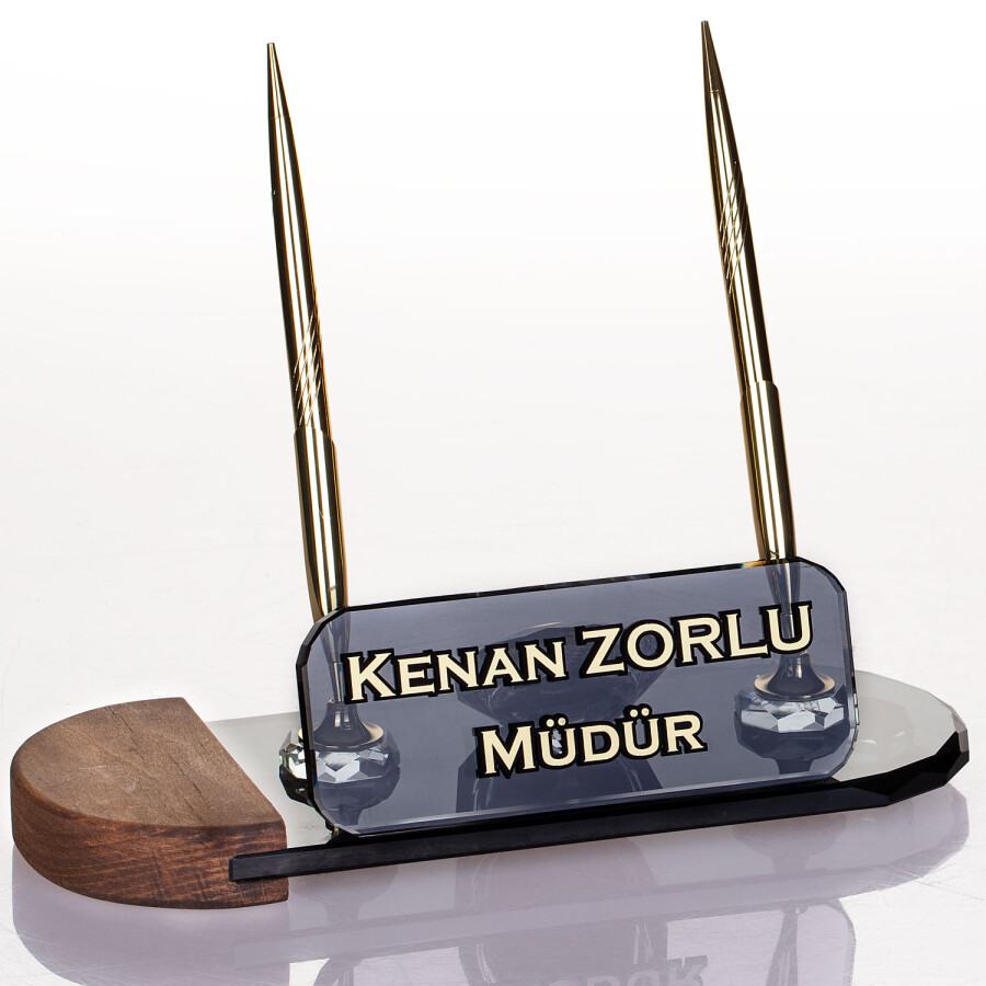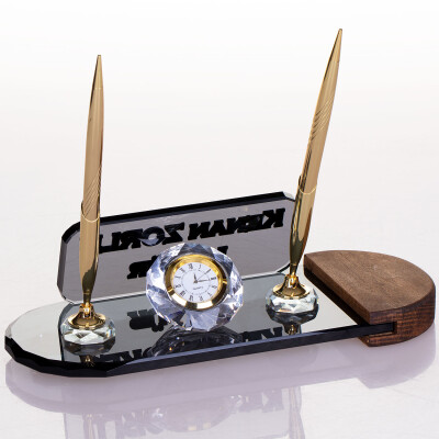 Ahşap ile kristal uyumunu ön plana çıkartan bu masa isimliğimiz tasarımıyla masalarınıza şık bir görüntü kazandıracaktır. Firmamıza ait üretim olan bu ürünümüzde doğal ahşap kullanılmıştır. Kristal üzerine altın renk aksesuarlarla dekore edilmiştir. Ürün üzerinde İki adet altın renk kalem ,kristal saatlik alanı ve altın renk geçme saat yer almaktadır.