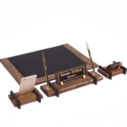 Fırınlanmış ceviz ağacından özel olarak dört parça şeklinde üretilen Naturel sümen takımı tamamen el işçiliği ile üretilmektedir. Kalitesi ve tasarımıyla masalarınıza şık ve asil bir görünüm kazandıracaktır. Sümen setimiz telefonluk alanı, kartvizitlik alanı, ahşap çerçeveli sümeni ve masa isimliği olmak üzere dört parçadan oluşmaktadır. Ürün üzerinde yer alan altın renk aksesuarlar, ürün çevresini saran ceviz ağacından üretilen özel yükseltici ayakları ile masanıza, ofisinize doğal bir şıklık katacaktır.